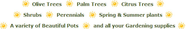 We are a well established nursery specialising in a wide variety of Mediterranean trees and plants. Also stocking a range of beautiful pots in all sizes. We are situated in Great Wakering, Essex and we would like to invite you to come along and view our selection